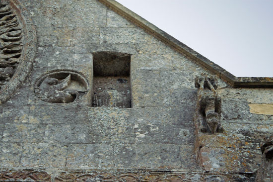 The west front of Trois Palis has the type of external sculpture that is unusual in England. Above the west door (which, like Barfreston, has three stages of decoration) are three figures of St John the Baptist, The Virgin Mary and St John the Apostle respectively. Above that are five sculptures: Christ at the centre and surrounded by (clockwise from top left) the Angel of St Matthew, the eagle of St John, the winged lion of St Mark and the winged bull of St Luke - the four evangelists. We can see the remains of the same imagery on the east front of Barfreston church. Note also the corbel table extended around the south end as it is around the east end of Barfreston.
