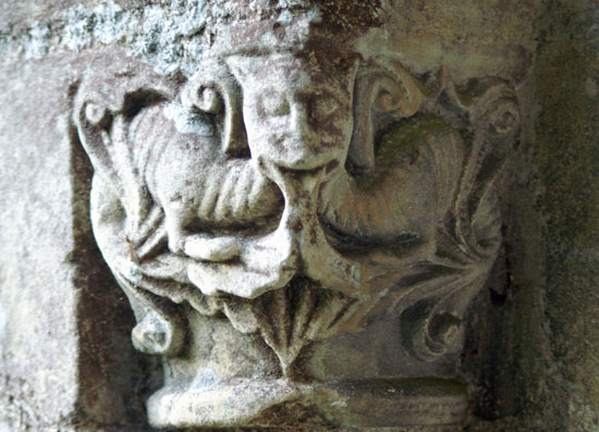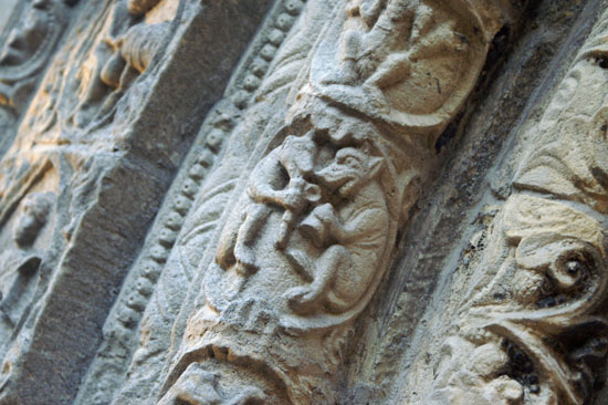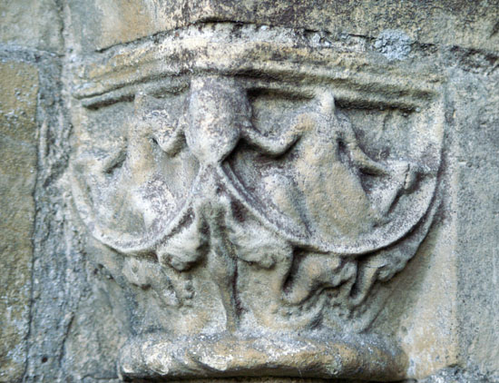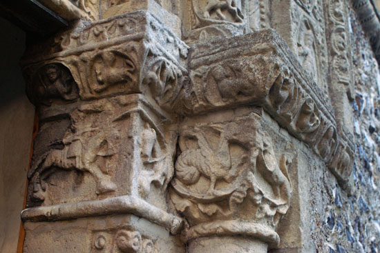 The south door capitals are still in fine condition despite some weathering. On the outer capital what looks like a mounted knight is, in fact, a centaur (horse’s body, man’s head) wearing, rather bizarrely, a contemporary soldier’s helmet. He is attacking a green mask figure who is simultaneously assailed by a monster from his left.