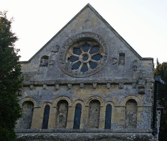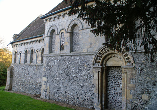 Barfreston Church, South side. The ornate south door can be seen, with a to blocked doorway to its east. Note the corbel table. Note also the upper masonry section with Caen stone to support the elaborate carving. Lower down the masonry is faced with local flint. Note also the arrangement of glazed and “blind” window mouldings. There is similar, but less satisfying, use of this device at Rock in Worcestershire.