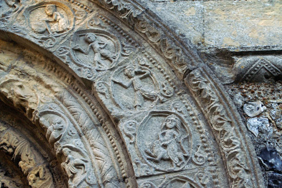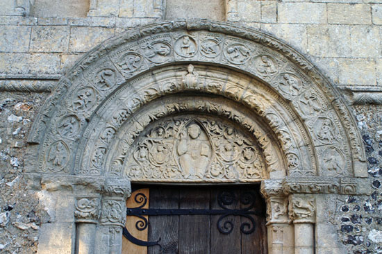 Barfreston Church dated from the late c11 and was endowed by the Norman knight, Hugo de Port. In 1180 it was remodeled, possibly by Hugo’s grandson, and most of the amazing carvings date from that period. Extraordinarily, the Victorian restorer, R.C.Hussey concluded that some of the stone was moved here, probably from Hackington Abbey nearby that was demolished due to its being seen as a threat by the monks of Christ’s Church at Canterbury. There were extensive internal alterations in the c19 that slightly diminish the Norman atmosphere, but not by much!