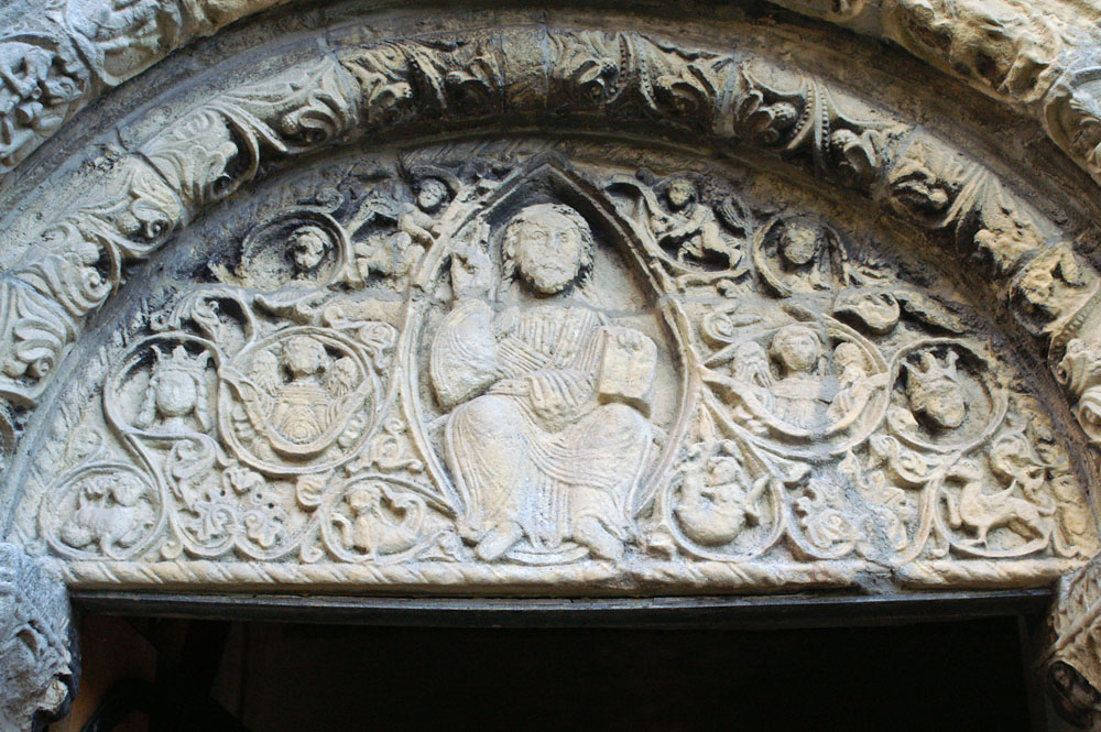 The tympanum. Christ in Majesty has his right hand raised in benediction whilest his left hand rests on a book. He is surrounded by various angels, whilst to left and right are very clear crowned “King and Queen” images. Might we assume these are Henry II and Eleanor of Aquitaine who were the English monarchs of the time that the decoration was commissioned? There are also griffons, mermaids, wyverns and so on amongst the foliage. The inner order of foliate decoration can be seen around this tympanum.