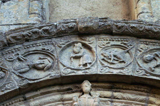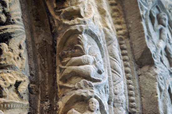The outermost course of decoration has Zodiac figures and the Labours of the Month. From the top in this shot we see a man with a sack and a staff - perhaps a pilgrim, but certainly bent with effort. Then two perormers of some sort - one stripped to the waist, the other clothed. Finally we see a figure astride a small animal - perhaps a dog.