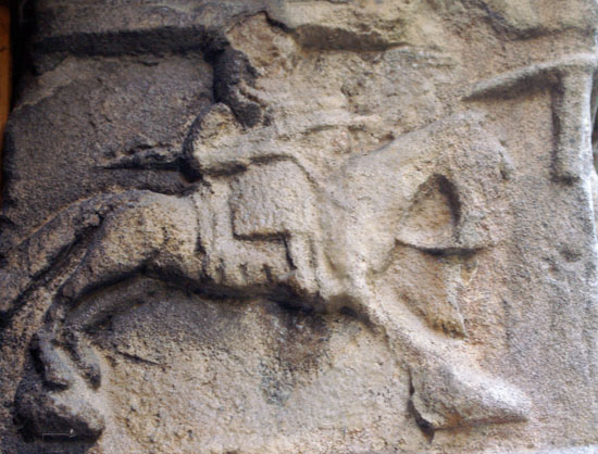 Above the south wall of the chancel, contiguous with the windows is this rather curious niche containing a decorated tablet. The larger motif is a giant moster or fish.