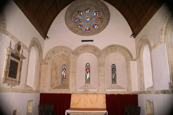 Inside the church is this splendid triple arch, with the wheel window framed bt the chancel arch itself. The blind arches to left and right would have housed altars. Norman string courses can be seen wending their way around the church, following the window openings. Note the Norman friezes to left and right and the beautifully sculpted chancel arch shafts.