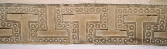 The T-shaped moulding (see above) proceeds all along the south wall and continues over the south door, where there are also splendid cat mask heads.