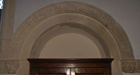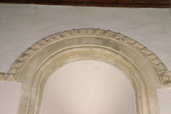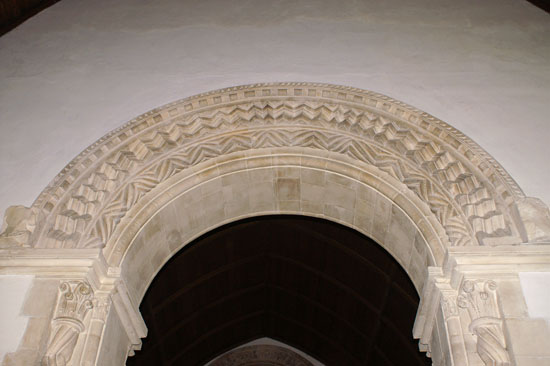Looking towards the west end, we see the rather unfortunate later west window, but elsewhere Norman round arches and mouldings are to be seen everywhere.