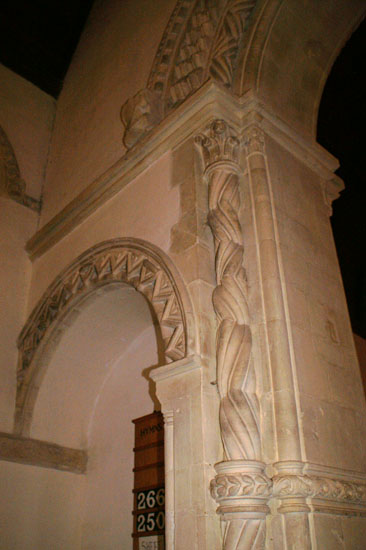 The chancel arch, again, is beautifully decorated. Note the fineness of the small capitals and of the twist design of the pillars.