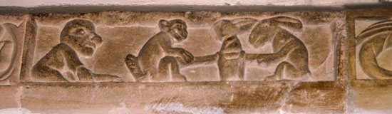 The three orders of decoration on the south door. The inner course is elaborate foliate decoration. The centre has a delightful series of images of musical animals. At the bottom we have a man playing a viol, with a rabbit and an unidentifiable second creature peering over his shoulder, Above him a bear plays a harp while a tumbler cavorts at his side. Then there is a bear playing some sort of wind instrument while a companion (surely not another bear?) is apparently either eating or drinking