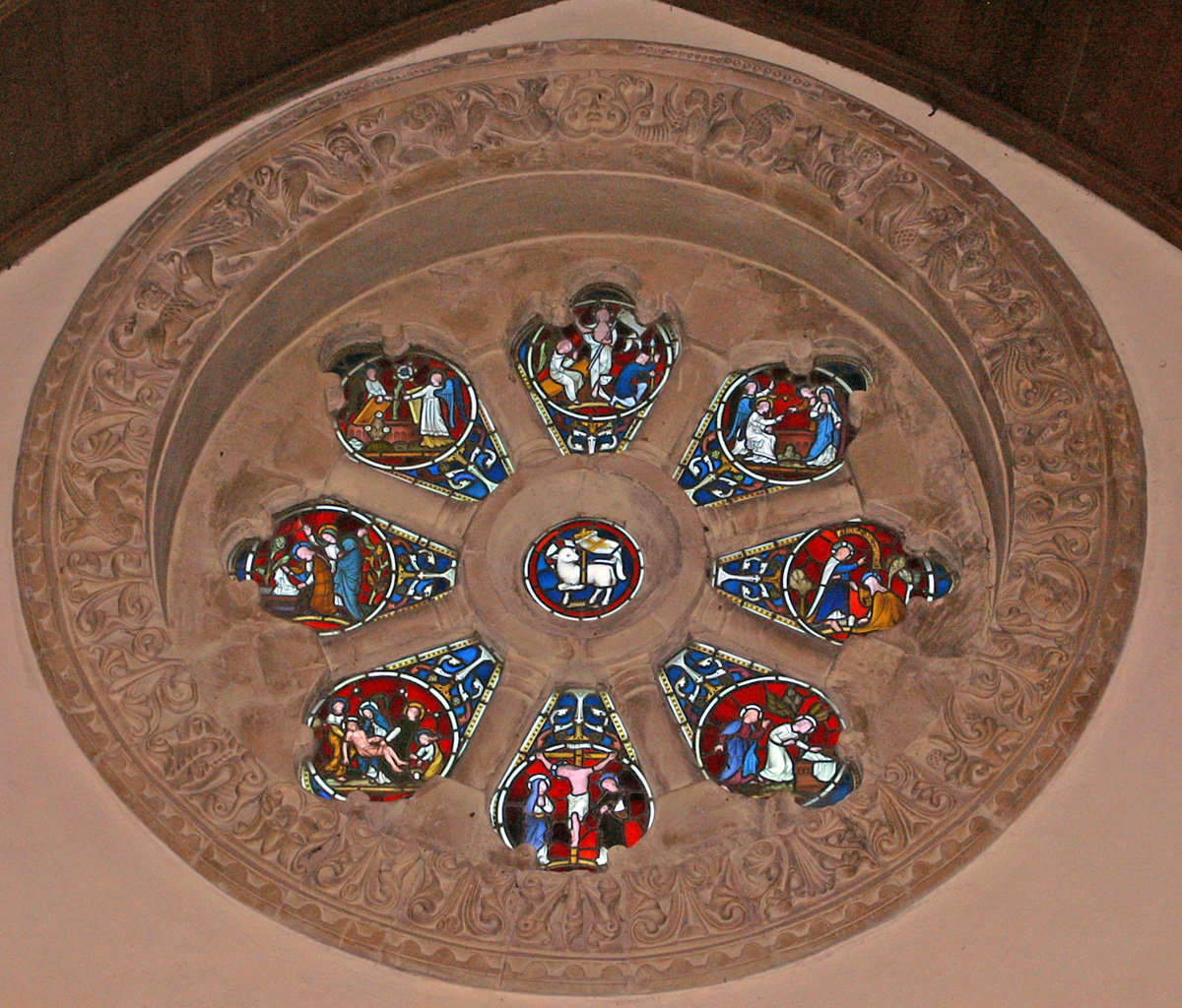 The wheel window from the interior. The top half of the window has mouldings of fabulous beasties, while the lower half is of foliage. At 12 O’clock there is some sort of face peering out.