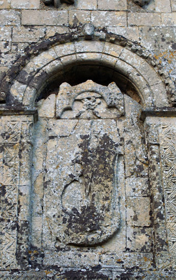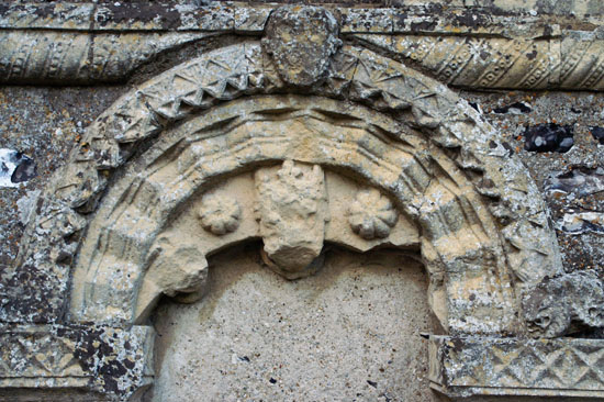 As if the south door were not enough, Barfreston also has blocked Norman doorways on the North Wall (left) and on the south side of the chancel (above). At the centre of the decoration is what looks like a crowned head flanked by two stylised flowers,