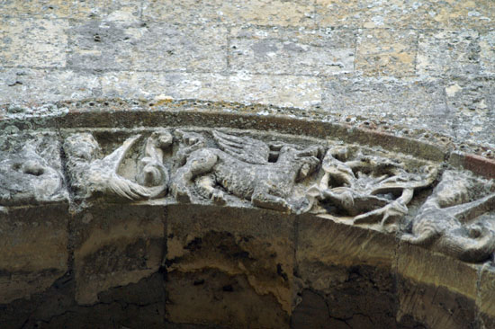 The south door capitals are still in fine condition despite some weathering. On the outer capital what looks like a mounted knight is, in fact, a centaur (horse’s body, man’s head) wearing, rather bizarrely, a contemporary soldier’s helmet. He is attacking a green mask figure who is simultaneously assailed by a monster from his left.