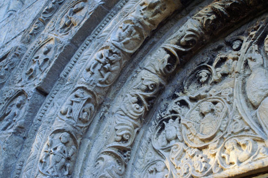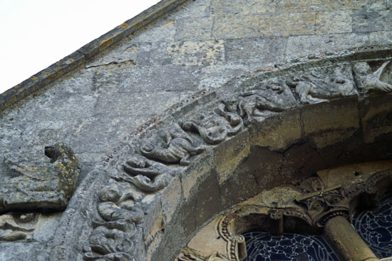 The tympanum. Christ in Majesty has his right hand raised in benediction whilest his left hand rests on a book. He is surrounded by various angels, whilst to left and right are very clear crowned “King and Queen” images. Might we assume these are Henry II and Eleanor of Aquitaine who were the English monarchs of the time that the decoration was commissioned? There are also griffons, mermaids, wyverns and so on amongst the foliage. The inner order of foliate decoration can be seen around this tympanum.
