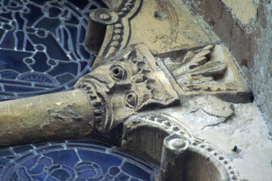 There are wonderful stylised mouldings above the triple lancet east window, particularly this one above the central arch. There are fascinating heads where the arches spring from each other, and another above the arch itself.