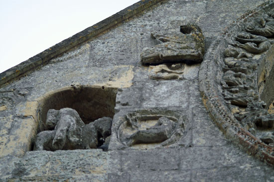 The west front of Trois Palis has the type of external sculpture that is unusual in England. Above the west door (which, like Barfreston, has three stages of decoration) are three figures of St John the Baptist, The Virgin Mary and St John the Apostle respectively. Above that are five sculptures: Christ at the centre and surrounded by (clockwise from top left) the Angel of St Matthew, the eagle of St John, the winged lion of St Mark and the winged bull of St Luke - the four evangelists. We can see the remains of the same imagery on the east front of Barfreston church. Note also the corbel table extended around the south end as it is around the east end of Barfreston.
