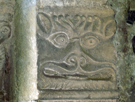 Each of the door jambs has a decoration of its own - in both cases a curiously flat image that almost seem like afterthoughts by one of the masons. On the left is another grinning cat and on the right a bearded man’s face.