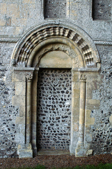 Barfreston Church, South side. The ornate south door can be seen, with a to blocked doorway to its east. Note the corbel table. Note also the upper masonry section with Caen stone to support the elaborate carving. Lower down the masonry is faced with local flint. Note also the arrangement of glazed and “blind” window mouldings. There is similar, but less satisfying, use of this device at Rock in Worcestershire.