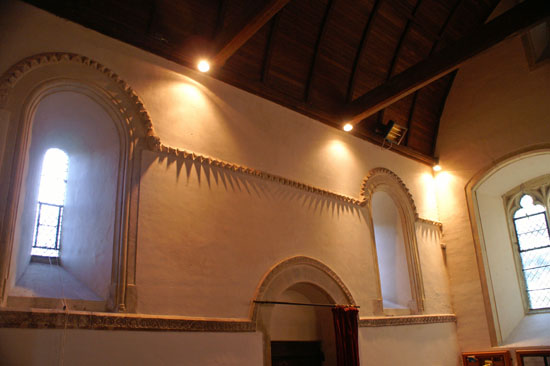 Inside the church is this splendid triple arch, with the wheel window framed bt the chancel arch itself. The blind arches to left and right would have housed altars. Norman string courses can be seen wending their way around the church, following the window openings. Note the Norman friezes to left and right and the beautifully sculpted chancel arch shafts.