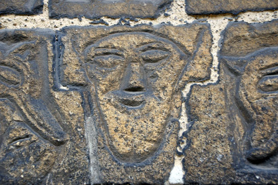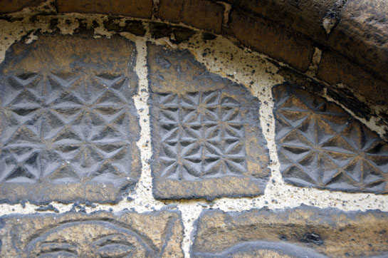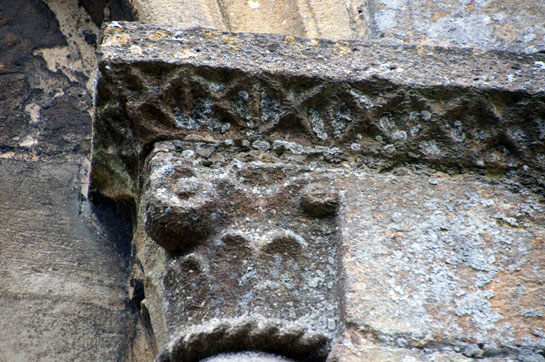 The south door capitals (left) to the east and (right) to the west of the door. The west side has two faces joined by what might be intended as a smaller third face. The east side is damaged and less easy to discern - but another head seems likely.