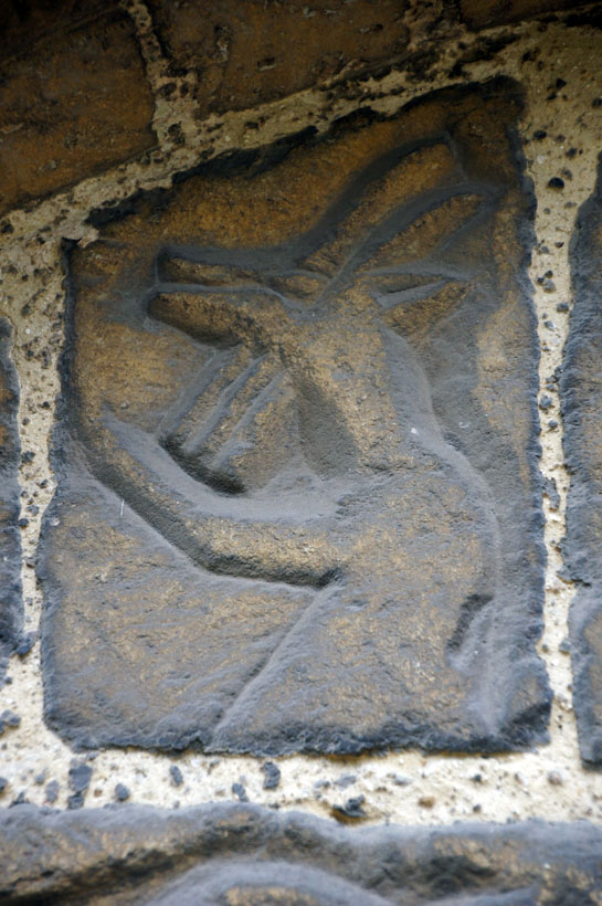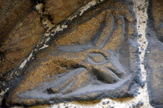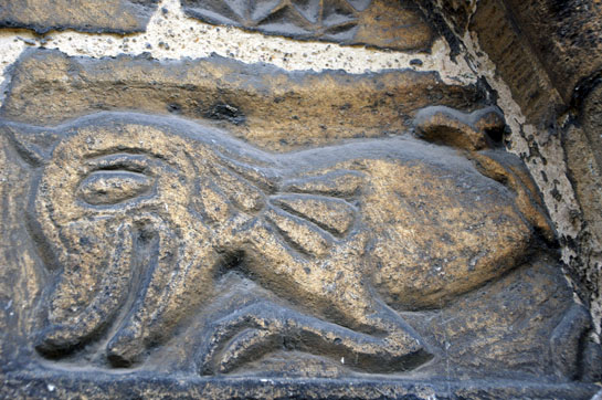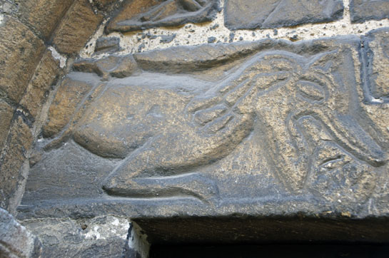 Left: The north door tympanum. It’s clearly been reset at some time. The upper chord is a bit haphazard with a saltire design seemingly filling in available space. It is worth bearing in mind that the demolition of the Norman south aisle probably resulted in the loss of an even more spectacular Norman doorway. Right: This monster has an inverted human head in its jaws. It has been suggested that these beasts are in fact lions because they have “manes”. Pevsner suggested the head to be that of Christ. The “lion” lobby unsurprisingly favours Daniel!