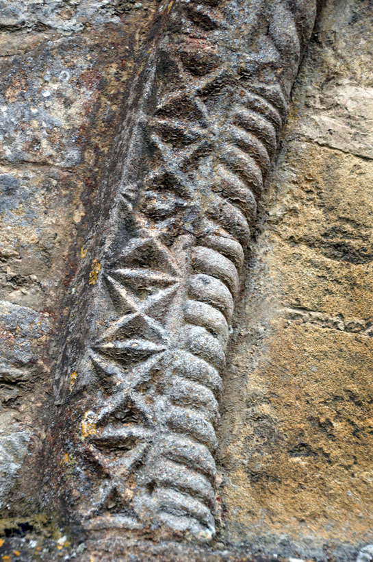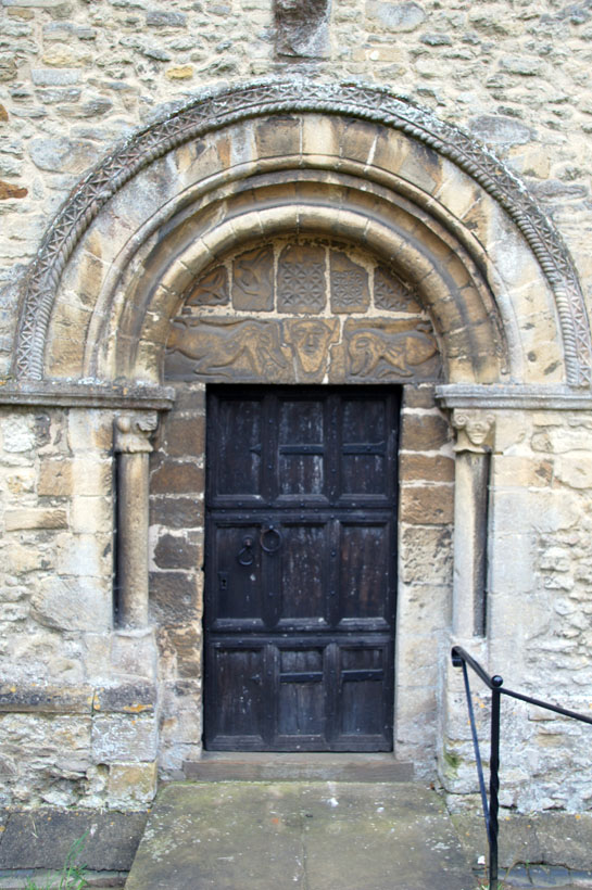 It’s a peculiar-looking place at first sight. I’d come here to see the Norman tympanum. It and its doorway are very conspicuous on the north side as you arrive. Your eyes are drawn to the rather unusual trefoil clerestory windows and then to the chunky battlemented tower. The rooflines are high and the the Norman doorway is somewhat dwarfed.