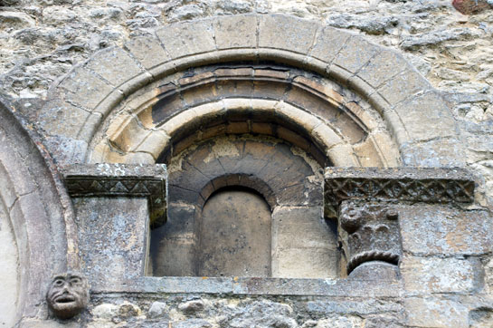 Left: This is the most interesting of the gargoyles. It is at the east end, again where the two rooflines join. It is a grotesque figure but in its hands is an animal. What might it be? Right: Detail of the Norman window on the north side of the Norman nave.