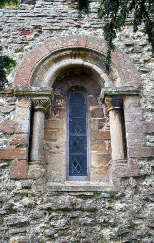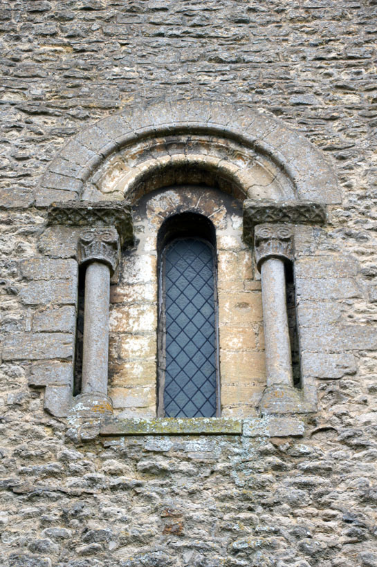 Continuing the theme of quite elaborate window spaces. Left: This one is in the north side of the tower. It has corinthian-style capitals surmounted by saltire chip decoration. Centre: The chancel north window, on the other hand, has a leaf design surmounted by plain abaci. Right: The tower. The decorated window is contiguous with the Norman doorway and with its companion on the nave rather badly mars the aesthetics of the tower,