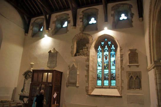 Left: The eastern arch south capital has two birds meeting beak-to-beak while on the left a smaller bird is apparently pecking one of the larger ones. Right: The north wall what was the Norman nave. If it’s messy on the outside it’s even more so on the inside with the addition of (my pet hate!) tablet memorials. Note the interior view of the old Norman window.