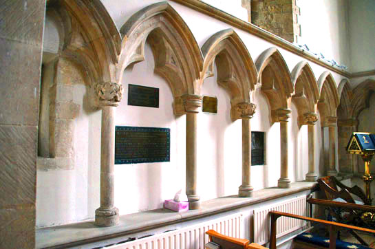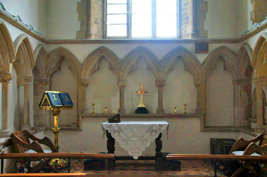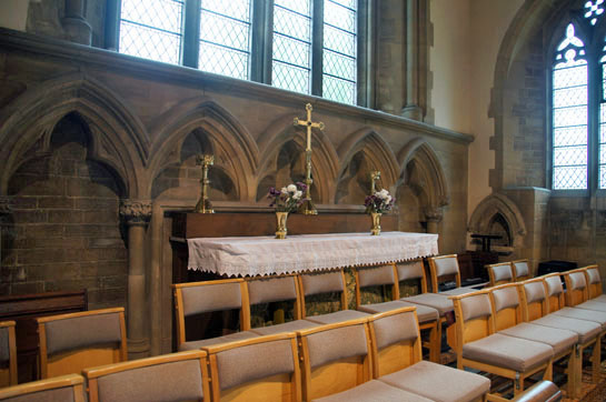 Left: The new altar with its gothic style arcading. Right: The old chancel with arcading some 600 years older.