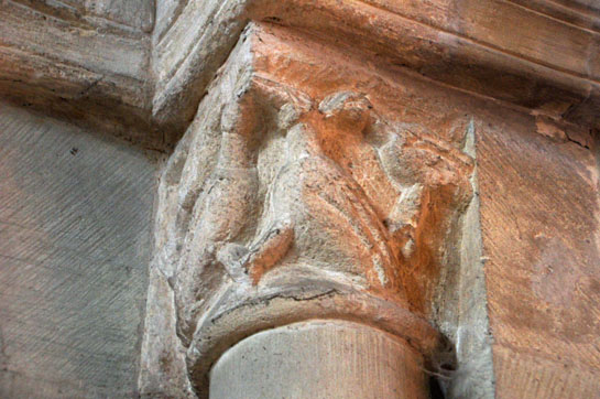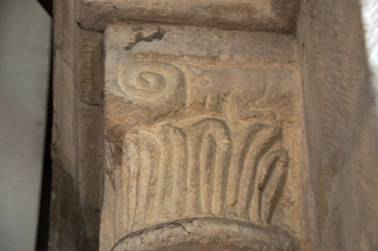 The tower arch capitals are, like many other compositions in this church, rather unrefined. Here we have two views of the eastern arch north capital. Left: Two faces peer out from the left a scroll volute (spiral design). Right: There is a further volute on the other side of the capital with a dog-like creature to its right.