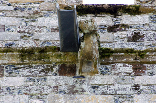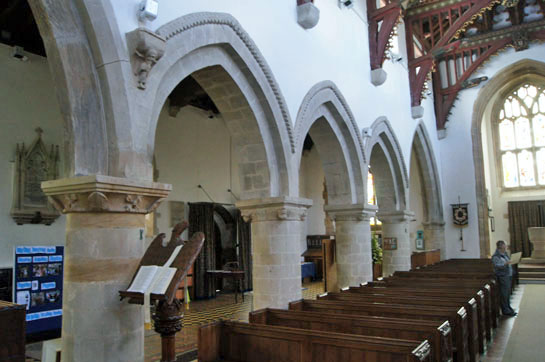 Left: This corbel sits somewhat orphaned at the conjunction of the south arcade and the old south transept arch. It is clearly older than the rest of the nave and probably a remnant of the church of AD1050. It doesn’t seem likely that it was in this position originally. Note the simply dog-tooth decoration around the south aisle arches. Right: The south aisle looking east. The east end was originally the south transept that was merged into the aisle in the c14. Various Turberville tombs - it was they that probably paid for the reconstruction work - can be discerned amongst the very modern clutter…
