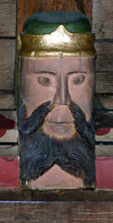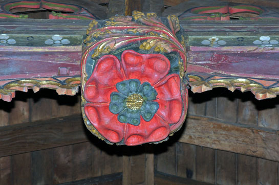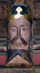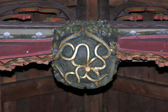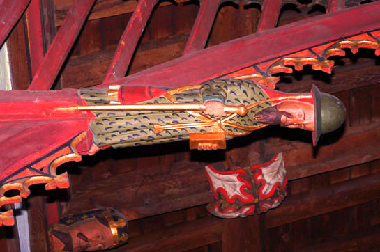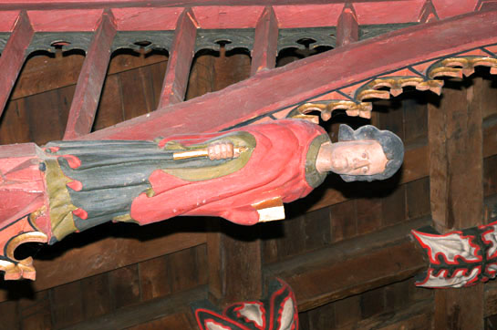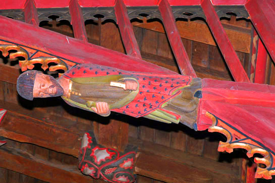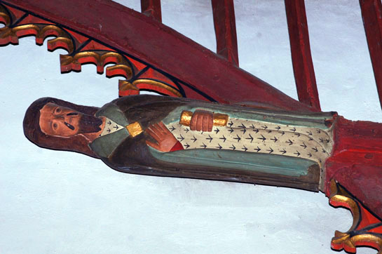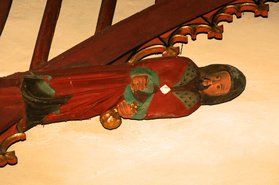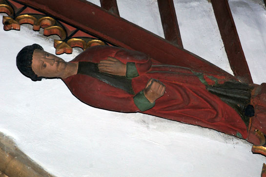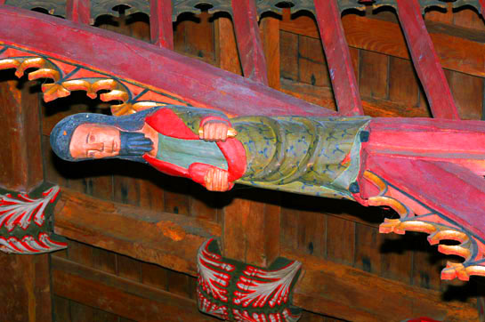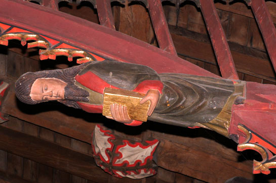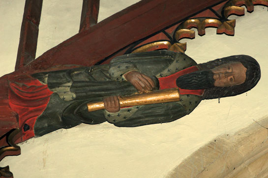 Photographing roof carvings can be a bit of a nightmare. Their height and the variable light within a church calls for a nightmarish combination of long telephoto lens and flash. Professional photographers would spend an age with tripods and lots of camera settings, but I don’t have enough time or patience, I am afraid. So all of the photographs of roof figures here have been manipulated in Photoshop to try to produce a fair impression of the vivid colours. So my apologies for the inconsistencies here. I always struggle individual apostles and their iconography so it was a bit of a relief to see that there is absolutely no concensus on which apostle is which and there have even been theories that they were not the apostles at all! An information board in the church helpfully lists all the possibilities - but I’m not recounting them here, I’m afraid! Annoyingly, I missed out one of the apostles in my pictures - sorry about that!