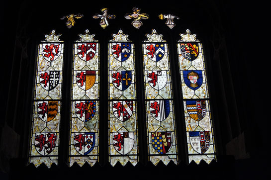 Left: The Skerne family tomb in the south aisle. I am indebted to the church’s own splendid website for this information: “The brasses are all intact bearing the date 1596…The Skerne family held land at Winterborne Kingston, and had descended from a branch of the Spanish kings of Castile and Leon. They were established at Winterborne Kingston at least by 1458 when Robert Skerne held the manor there, and John Skerne, whom this monument commemorates, seems to have been the last of his line, dying in 1593”. Right: The Turberville window. This seems to be a bit of a misnomer because it shows the arms of all those who held the manorial rights in Bere Regis beginning with the Turbervilles.