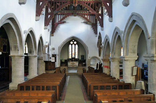 Left: Looking towards the east end. Note the large squint to the right of the chancel arch which, unusually, still has its iron grille in place. Right: Looking towards the west end. To the left is the enlarged arch to the old south transept that is now part of the aisle itself. Note the higher arches at the western end of both arcades from when the nave was extended westward. The Norman font sits in pride of place on a raised podium under the west window.