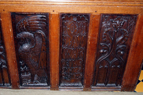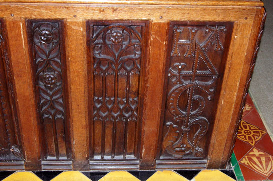 It was not until the c16 that the church acquired its west tower. Local stones were used to create a chequerboard effect. The north transept was subsumed into an extended north aisle and a private chapel for the Morton family occupied this new space. Finally, some carved bench ends survive from this period. We know this because one is dated 1547 in Roman numerals.