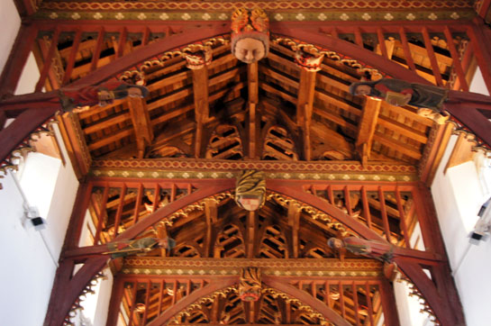 Two shots of the fabulous hammerbeam roof. The bosses at the apexes of the arches are large and finely-drawn. To left and right we can see some of the twelve apostle figures.