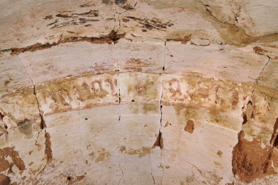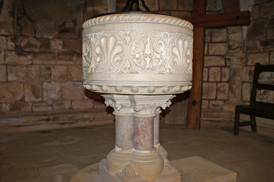 Left: Above the east window of the crypt is this mediaeval paint fragment. Right: The caen stone font is, alas, modern.