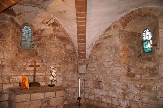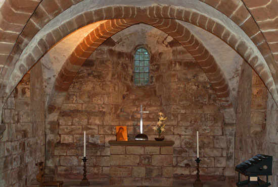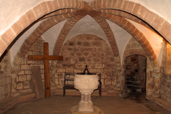 Left: The eastern end of the crypt. Note the quadripartite vault. Right: The western end of the crypt with its octagonal plan and vault.