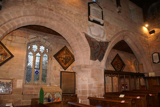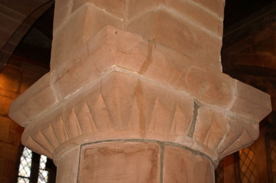 Left: Another view of the north aisle, this time looking west. This is rather a cluttered church. There are no fewer than 3 hatchments in this picture as well as funeral tablets and lots and lots of woodwork! Hatchments were painted coats of arms of deceased (rich) people that hung outside their houses until the mourning period was over, after which time they were hung in the church. Right: One of the simple scalloped capitals of the Norman north arcade.