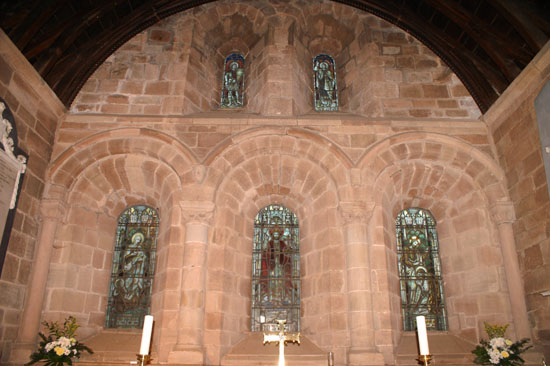 Left: The north arcade - which is remarkably narrow - showing an original Norman arch to the left and an early English one (right). The gothic arch dates from the installation of the side chapel in c14 and weaknesses caused reconstruction of the whole arcade in c15. The walls are of unadorned stone. Right: The east end of the chancel with its delightful and unusual array of five Norman windows.