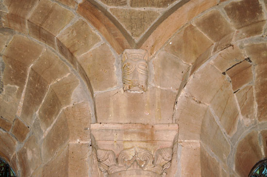 The nave was constructed in about 1050 and the chancel followed shortly afterwards. The eastern part of the crypt too is believed to be from this date. The chancel itself, the chancel arch and the two westernmost of the three arches of the north arcade are very obviously Norman. This is not the exuberant and decorative Norman of, say, Barfreston or Iffley. Arch decoration and capitals are restrained. There is a corbel table around the exterior of the chancel, but the carvings are quite mannered - even dull - compared with the riotous melange at
