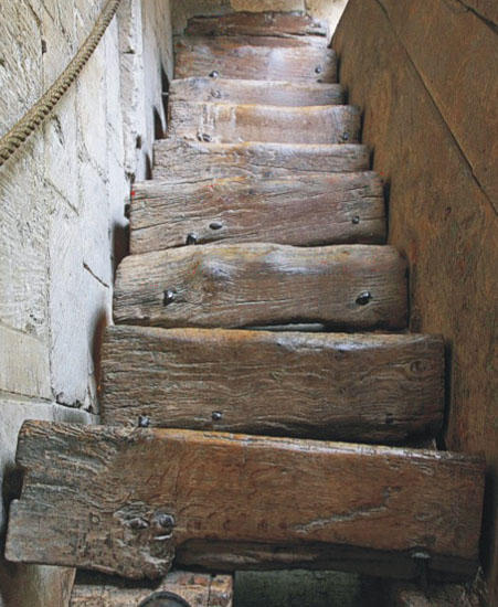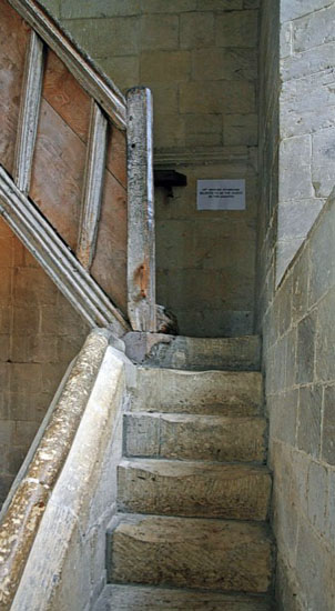 I am indebted to Ann Jessop for pointing out that I hadn’t noticed the ancient stairway that leads from the north transept to the bell ringing chamber. The upper portion (left) is cut from solid oak logs. This picture is looking downwards from the top. The lower section is of stone (right). The rail of the wooden section is of one continuous piece of elm and is filled in with wooden panels.