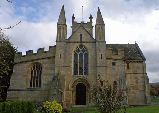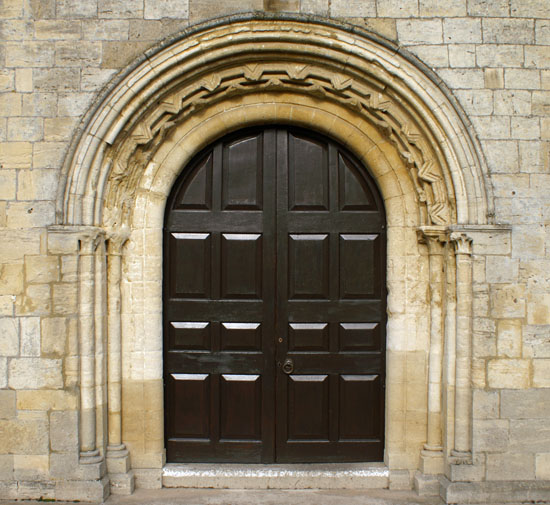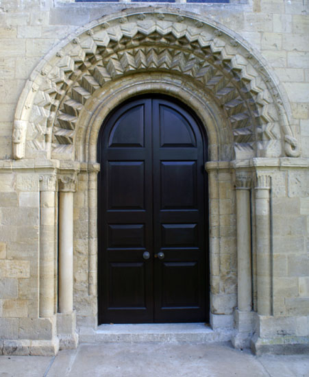 The west end (above). The central part is the original Norman/Transitional building, as is the porch to the right. The battlemented aisles are, however, incongruous. The west door (right) is Transitional. It eschews the mass of beasts and ghouls that characterise much of late Norman architecture and has an outer moulding of small fleurs de lys - a sophistication of the Transitional period.