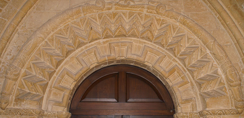 This restraint is repeated on the outer door of the porch (right) with its plain outer mouldings and a sophisticated inner courses of chevron mouldings set at right-angles to each other. This is the “last knockings” of the Romanesque.