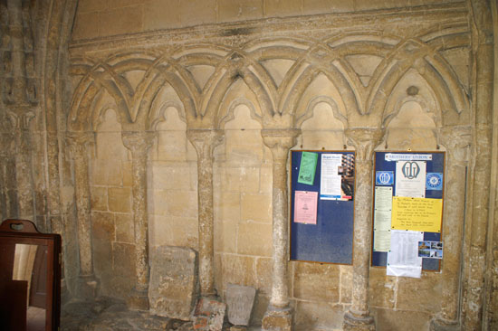 Left: The south door demonstrates again the “norm” at Bishops Cleeve of geometric decoration embellished by a restrained use of monsters and serpents on the outermost course. There is a distinctly “Scandinavian” look to these images. Unlike on the west door, however, the serpents on the south door have bodies that link together and form the hood mould. Right: Transitional blind arcading lines both side walls of the porch - whilst making convenient niches for notice boards!