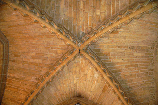 Left: The porch has a ribbed and vaulted ceiling. The view to the east end. Right: The Norman piers of the arcades are massive with simple capitals. However, each aisle has three bays only where there were originally six. This rebuilding occurred in the c16 or c17 in order to free up space in the church. Note to left and right of the chancel arch the Norman doorways to the original transepts.