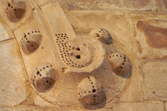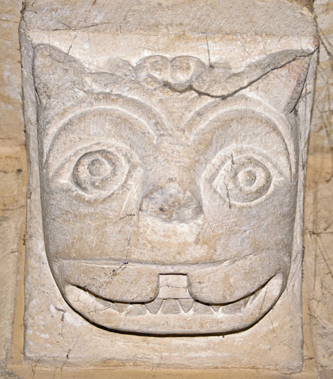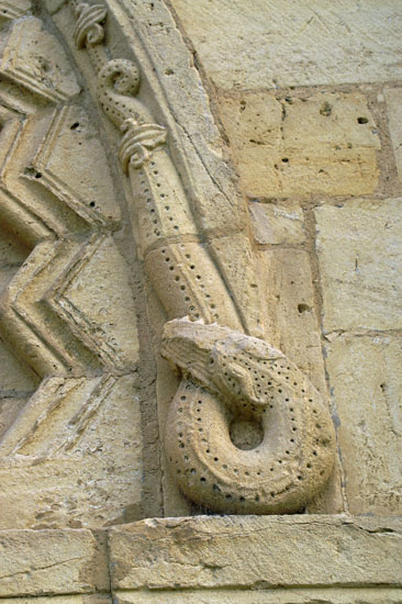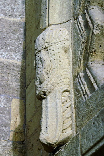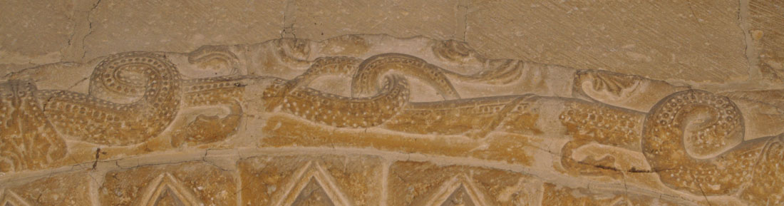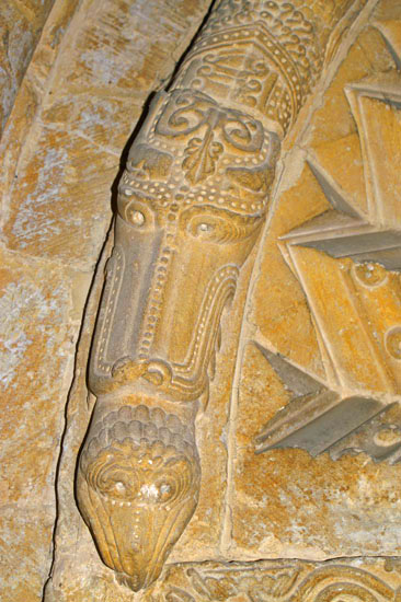 The west doorway does, however, have these fine serpents on the ends of the decorative courses. In time-honoured fashion, the one on the south side (left) is determined to eat itself, whilst the one on the north side (centre and right) is content to show off his spectacularly vicious teeth!