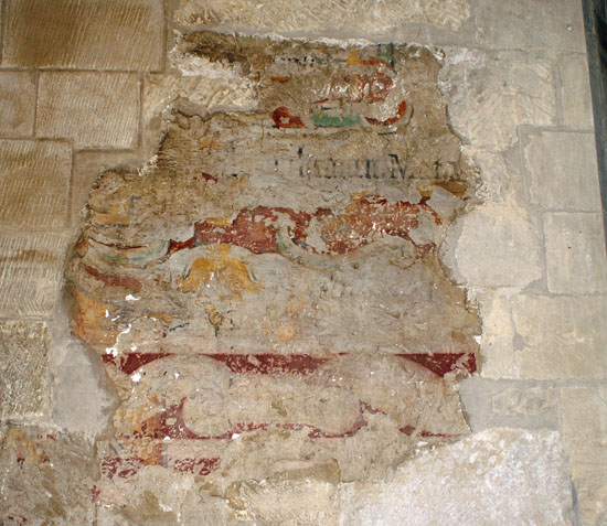 Left: The chancel dates from about 1310 and is of the Decorated period. It is a somewhat austere space that does little justice to the rest of the church. The east window has unusual tracery that would be splendid if it were original - but sadly it is a c19 replacement. Right: Bishop’s Cleeve, like many churches, has some fragments of the painting that would once have covered the entire interior. This example is in a blocked Norman window in the south transept.