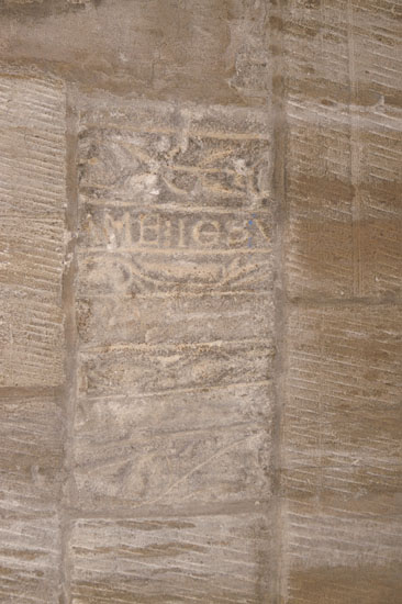 Left: A Norman pillar piscina is built into a recess in the south transept - although this was not its original position. The sharp-eyed reader will have noticed the ogee (S-shaped) arch in the niche above which confirms this to be of the High Gothic period. For my money, that pillar looks a bit suspicious too! Centre: This stone is believed to have been part of the original north aisle and therefore Norman. The words are “me jesu”, presumably left by a mason. Right: Looking to the west end of the south aisle with the gallery to the right and the south door to the left.