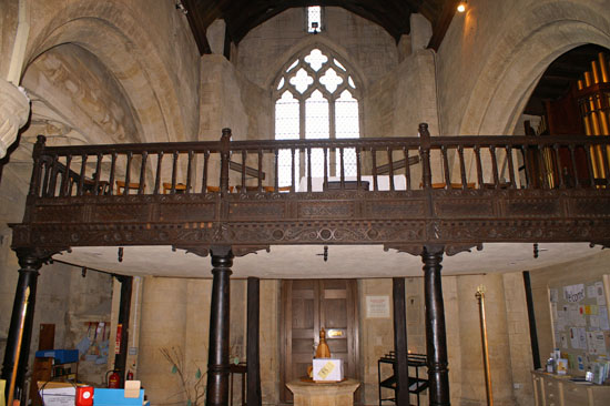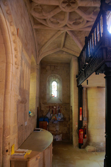 Left: Capitals on the north side of the door to the Norman north transept. Right: At the west end is a c17 Jacobean gallery of carved oak.