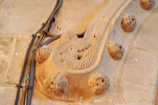 Close up of the centre of the south door showing the intertwining of the tails of the crocodile-toothed monsters (pictures above)